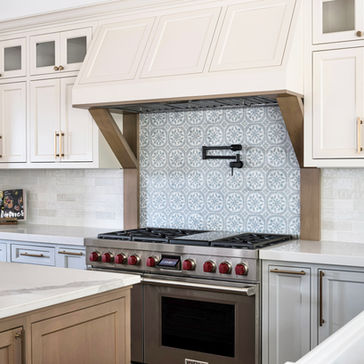 The kitchen is an absolute showpiece, anchored by a custom painted wood range hood, cream shaker cabinetry with glass uppers, brushed gold hardware, and a dramatic encaustic patterned tile backsplash framed behind a professional range. Thick slab quartz countertops and a well-proportioned layout make the space as functional as it is beautiful, while the seamless connection to the surrounding living areas keeps the home feeling open and cohesive throughout.