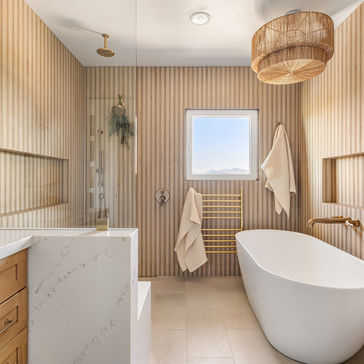The primary bathroom is where this project really surprises people. Floor to ceiling natural wood slat wall tile paneling wraps the entire space and creates an incredibly warm, spa-like atmosphere. A freestanding soaking tub, marble vanity surfaces, brushed brass fixtures, and a rattan pendant light complete the transformation. It feels like a luxury hotel bathroom tucked inside a 1950s Fletcher Hills home, which was exactly the goal.