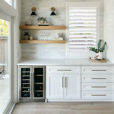 The kitchen is massive and designed to handle it. All white cabinetry, an oversized island, a professional range, and a bold geometric patterned tile backsplash make the space feel high-end and purposeful. Floating wood shelves, brushed brass fixtures, and a mix of pendant styles add warmth and personality to what could have easily felt sterile at this scale. A built-in bar and wine fridge tuck neatly into the layout, adding function without taking anything away from the overall flow.