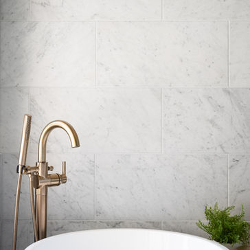 The primary bathroom is where the project goes to another level entirely. Floor to ceiling marble wall tile wraps the space and creates something that feels genuinely luxurious. It is the kind of detail that a homeowner notices every single morning and never gets tired of.