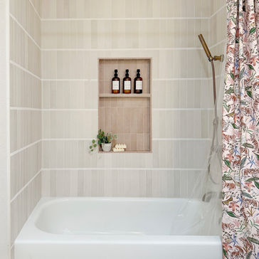 The bathrooms carry the same level of intention. Floor to ceiling vertical tile, a spacious curbless shower with grab bars integrated into the design, a built-in shower niche, warm wood vanities, and thoughtful clearances throughout make the spaces fully functional without ever reading as clinical. The secondary bath with the soaking tub, floral shower curtain, and tiled niche feels cozy and personal.